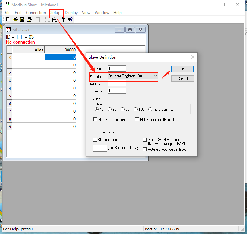 點擊Setup--Slave Definition--function,選擇04功能碼,點擊Ok。
