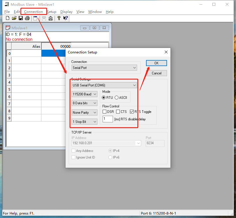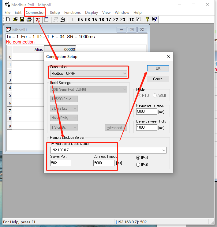 11、點擊connection--connect,connection選擇Modbus TCP/IP,IP地址填USR-M511的Ip地址,Server port填USR-M511的端口號502。