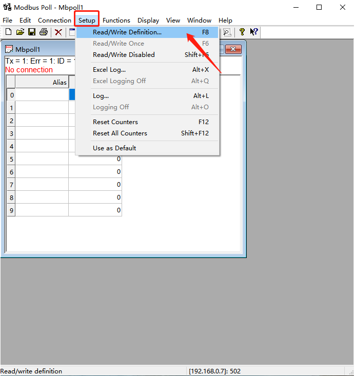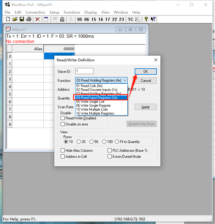 Setup--Read/Write Definition--Function選擇04功能碼,點擊OK。