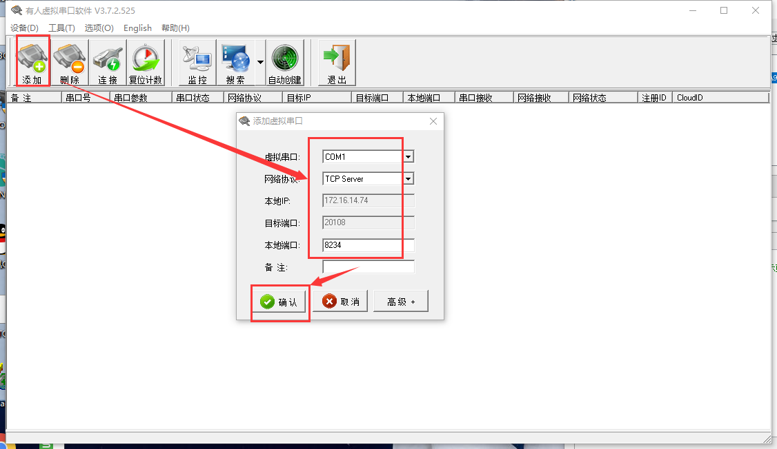 網(wǎng)絡協(xié)議選擇tcp server,本地端口設置為8234