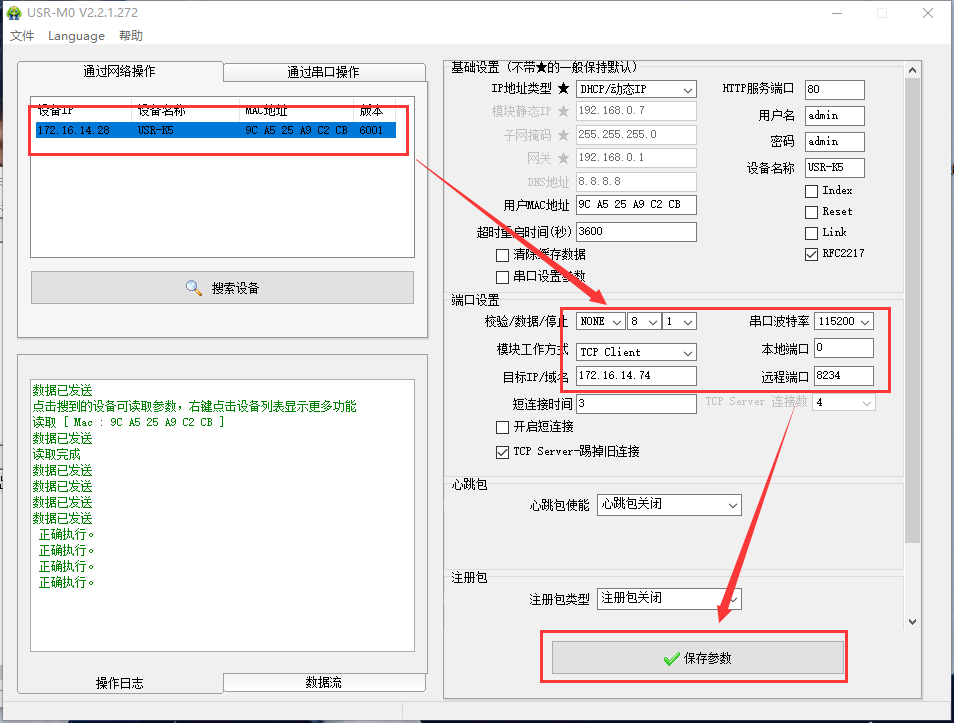 點擊“搜索設備”,當搜索列表中出現(xiàn)K5的設備后,單擊搜索到的設備,設置配置信息并保存(動態(tài)Ip),工作方式選擇TCp Client,目標ip為虛擬串口Ip:172.16.14.74,遠程端口為虛擬串口的本地端口號:8234