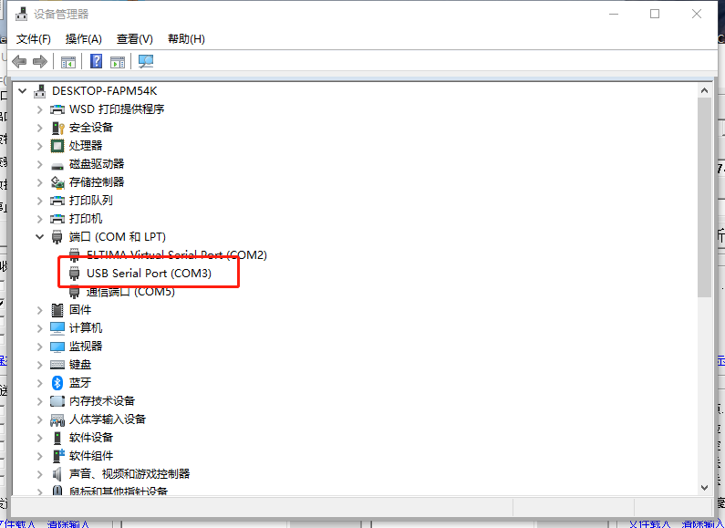 在設備管理器中查看端口信息,確定K5串口使用的串口號,如下圖所示電腦端口號為COM3