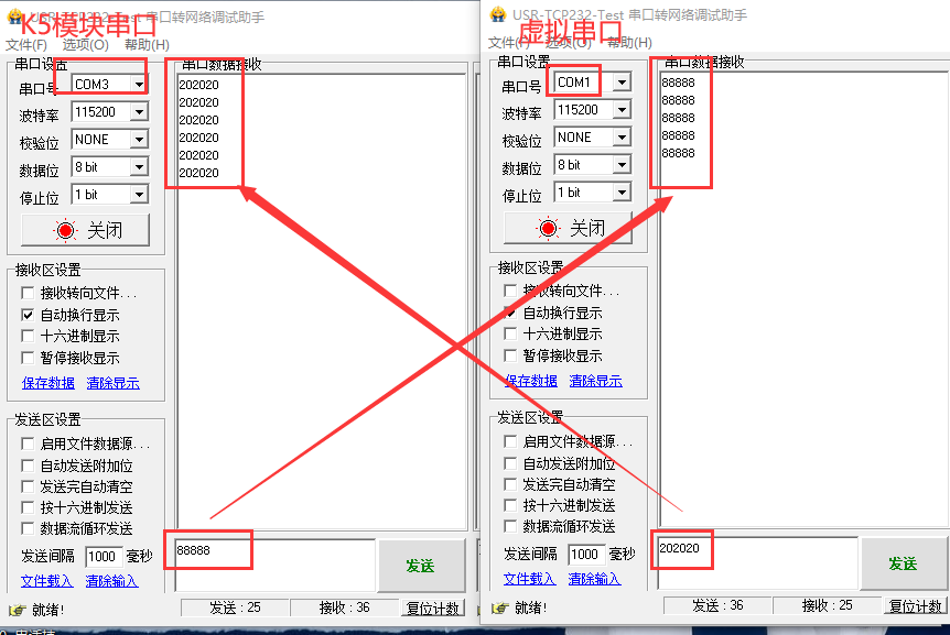 同時打開兩個串口轉(zhuǎn)網(wǎng)絡助手軟件。一個選擇虛擬串口,一個選擇COM3,即可進行收發(fā)測試
