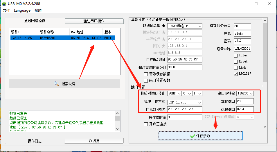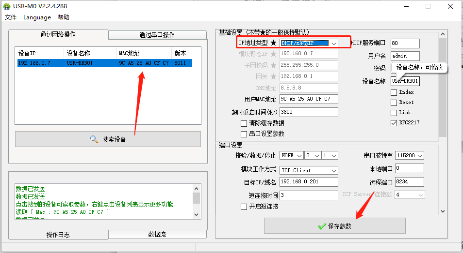 點擊“搜索設備”當搜索列表中出現(xiàn)301的設備后,單擊搜索到的設備,右邊基礎設置,在“IP地址類型”將靜態(tài)IP改為DHCP動態(tài)獲取,點擊保存參數。