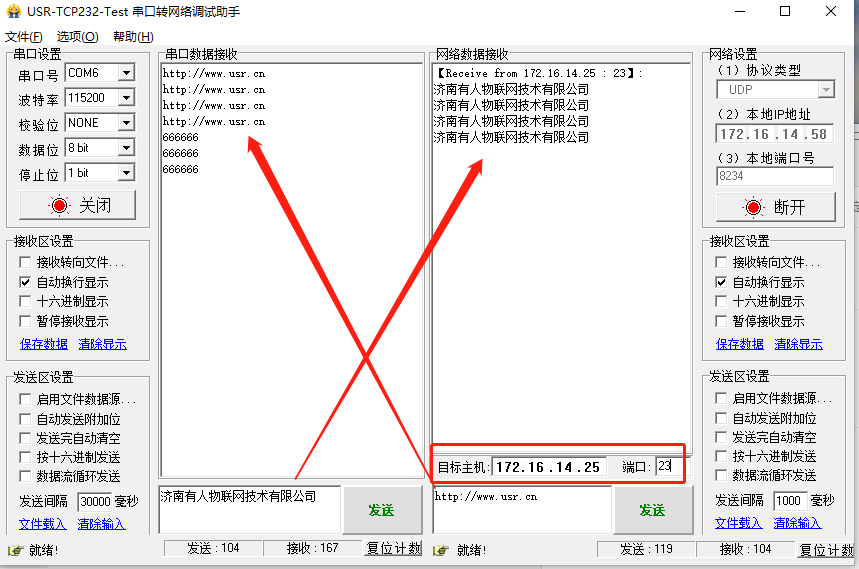串口數據可經由DR301發(fā)往已經建立UDP通信的兩臺電腦,同樣,兩臺電腦的數據可以經由DR301發(fā)往串口,具體測試如下。
