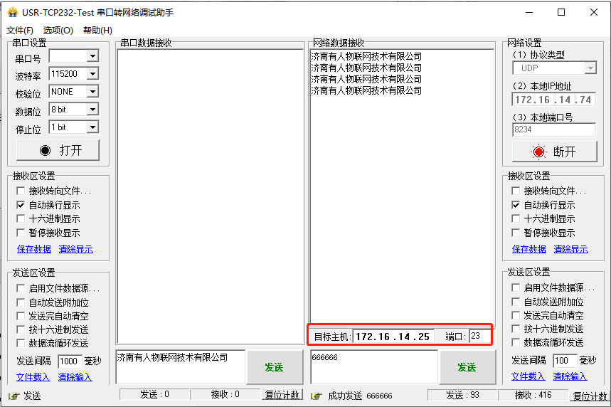 在第二臺電腦打開串口調試助手,網絡端協(xié)議類型選擇UDP,本地IP:172.16.14.58(此時路由器分配給PC的IP),本地端口號:8234。