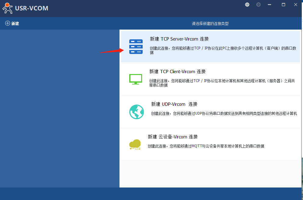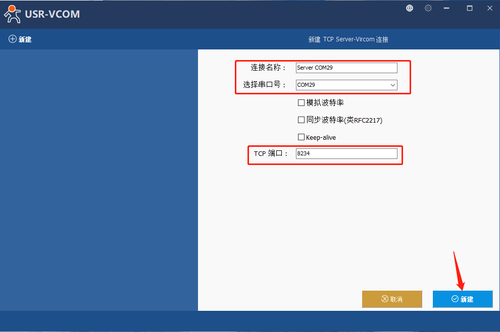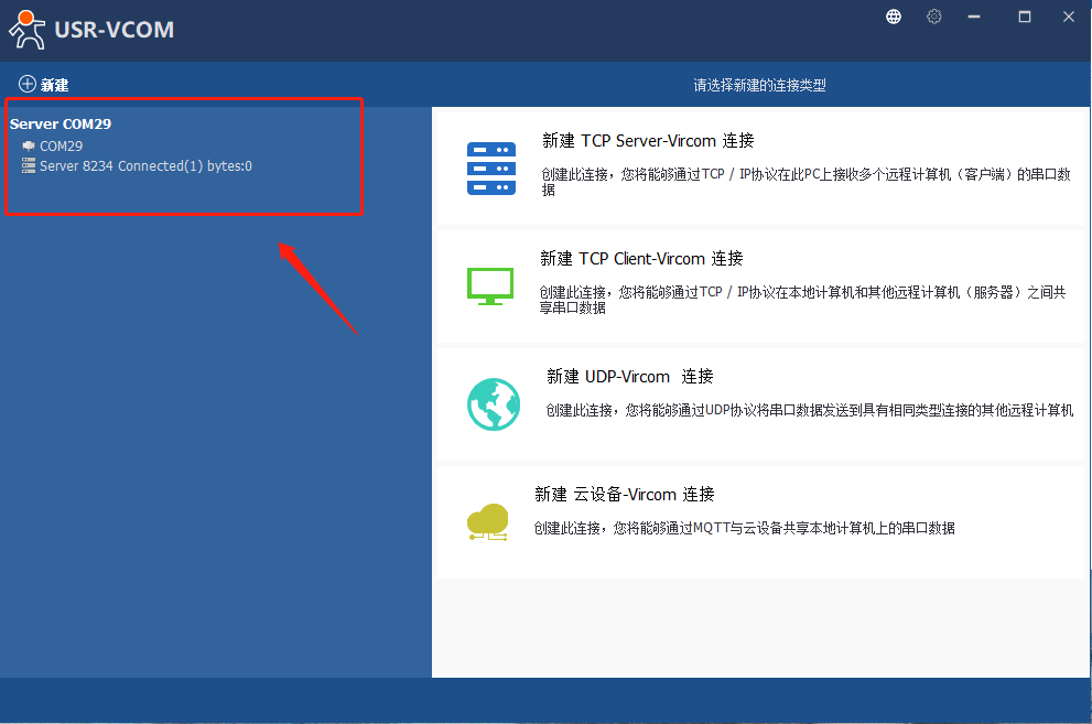 6、打開虛擬串口軟件,點(diǎn)擊“新建TCpServer-Vircom連接”,選擇新的串口號(hào)(為了避免串口沖突,盡量往大選),此處以COM29為例,TCp端口設(shè)為8234,點(diǎn)擊新建,可以看到自己剛剛創(chuàng)建的虛擬串口。