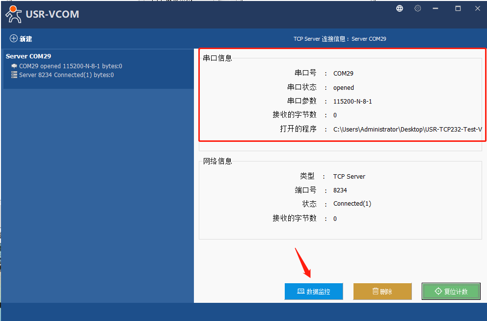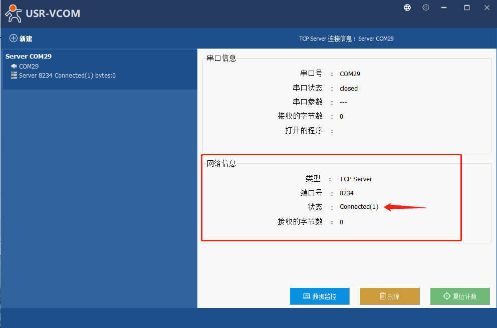 7、點(diǎn)擊新建立的虛擬串口,可以看到網(wǎng)絡(luò)信息狀態(tài)顯示Connected(1),代表已經(jīng)建立連接。