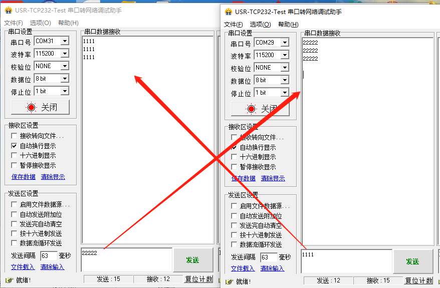 8、打開兩個(gè)串口調(diào)試助手軟件,串口端選擇正確的串口(設(shè)備插在電腦上所識(shí)別到的COM口可在設(shè)備管理器--端口處查看)以及串口參數(shù),301出廠默認(rèn)115200,N,8,1。打開創(chuàng)建的虛擬串口后,虛擬串口界面顯示串口信息為:Opened。