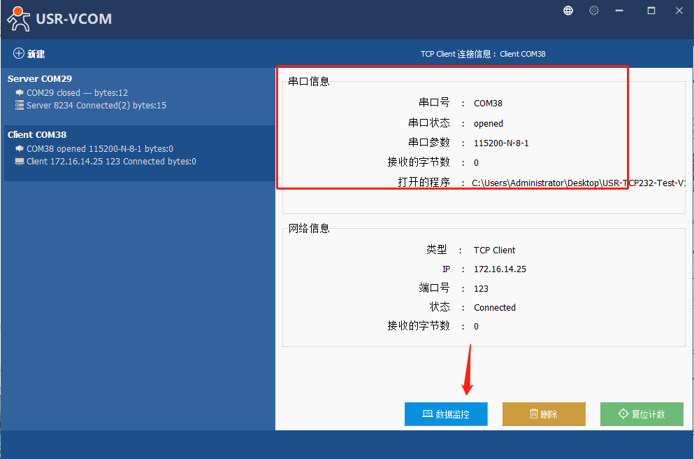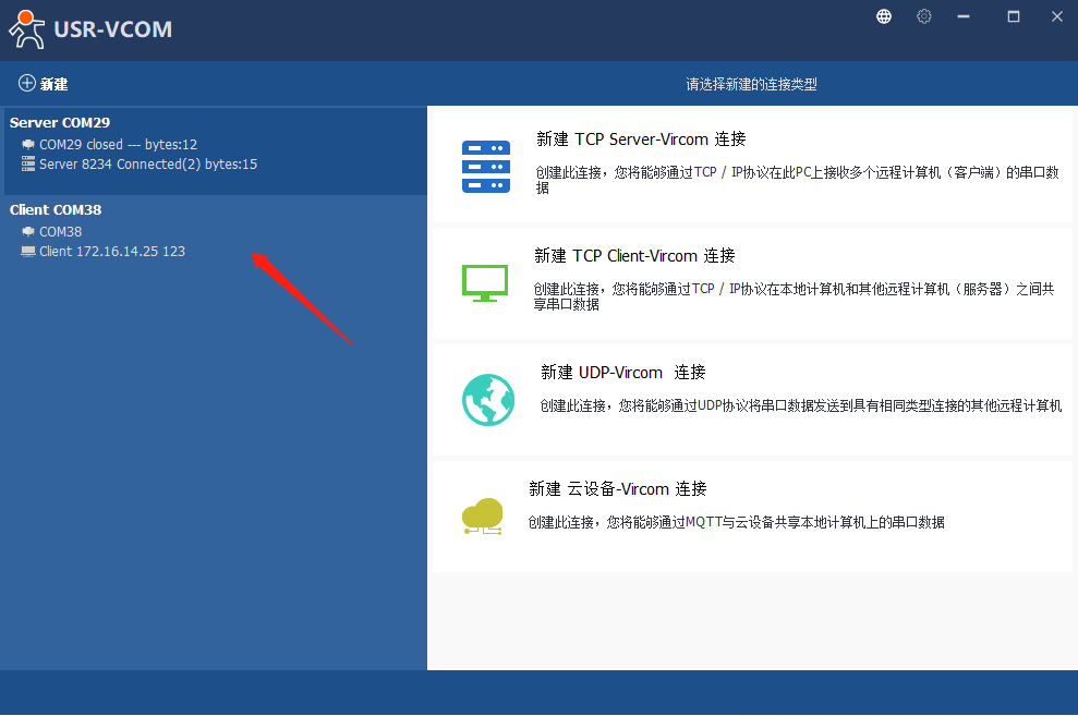 11、打開虛擬串口軟件,點(diǎn)擊“新建TCp Client-Vircom連接”,選擇新的串口號(hào)(為了避免串口沖突,盡量往大選),此處以COM38為例,遠(yuǎn)程主機(jī):172.16.14.25(路由器分配給301的Ip),遠(yuǎn)程端口設(shè)為123,點(diǎn)擊新建,可以看到自己剛剛創(chuàng)建的虛擬串口。
