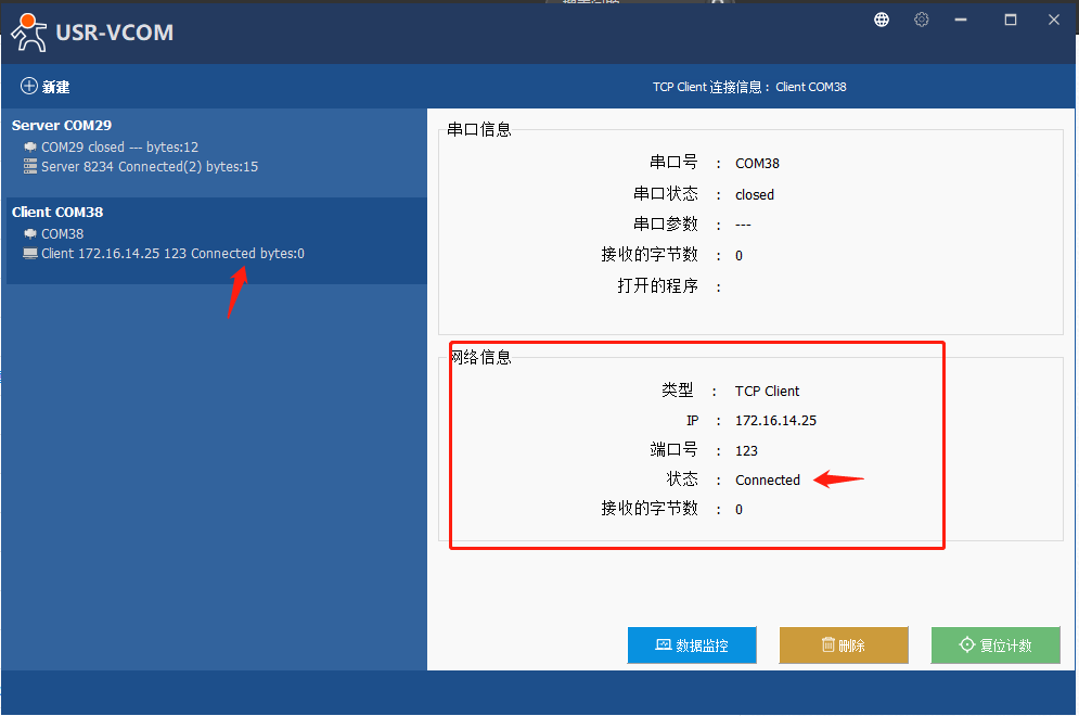12、點(diǎn)擊新建立的虛擬串口,可以看到網(wǎng)絡(luò)信息狀態(tài)顯示Connected,代表已經(jīng)建立連接。