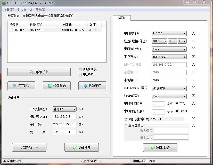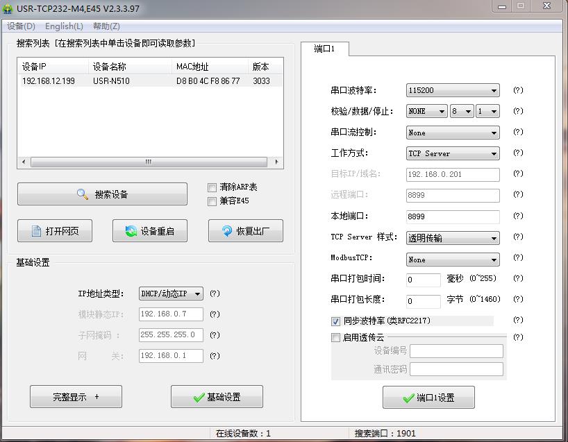 用M4設(shè)置軟件搜索USR-N510的IP,192.168.0.7,USR-N510用串口設(shè)置軟件設(shè)置DHCP,動(dòng)態(tài)獲取IP。