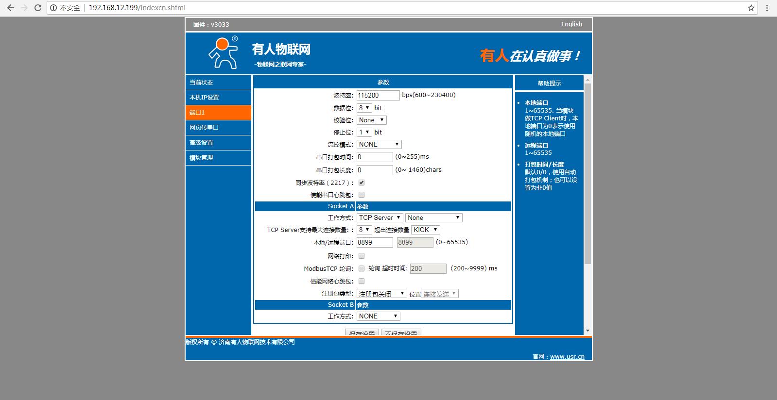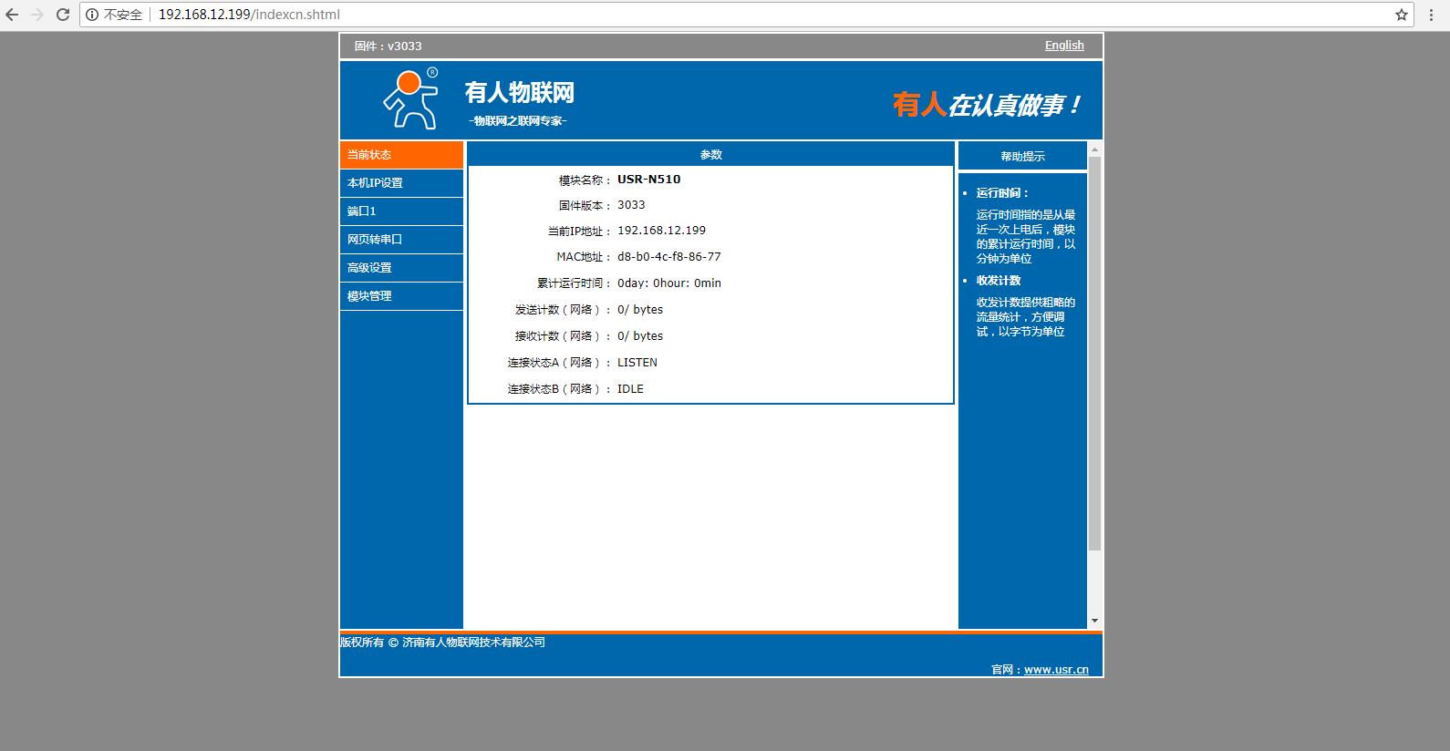 在瀏覽器輸入N510的IP,可以登錄N510的內(nèi)置網(wǎng)頁。工作方式TCP server 本地端口8899