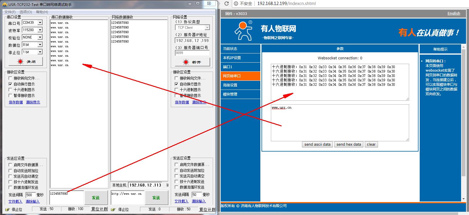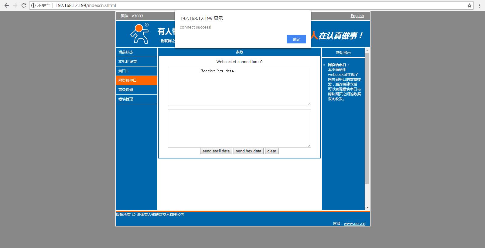 同時(shí)N510網(wǎng)頁打開websocket頁面,顯示連接成功,然后測(cè)試串口和websocket之間的數(shù)據(jù)傳輸。