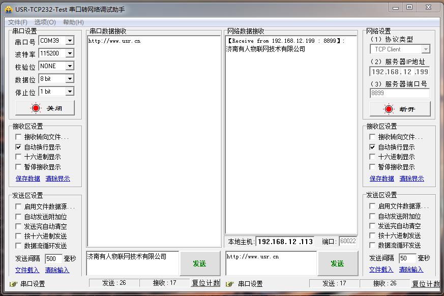 在電腦下載,并安裝打開USR-TCP232-TEST 串口網(wǎng)絡(luò)助手。建立TCP連接,USB-RS232串口線接電腦,就可以實(shí)現(xiàn)N510串口和網(wǎng)絡(luò)之間數(shù)據(jù)傳輸。