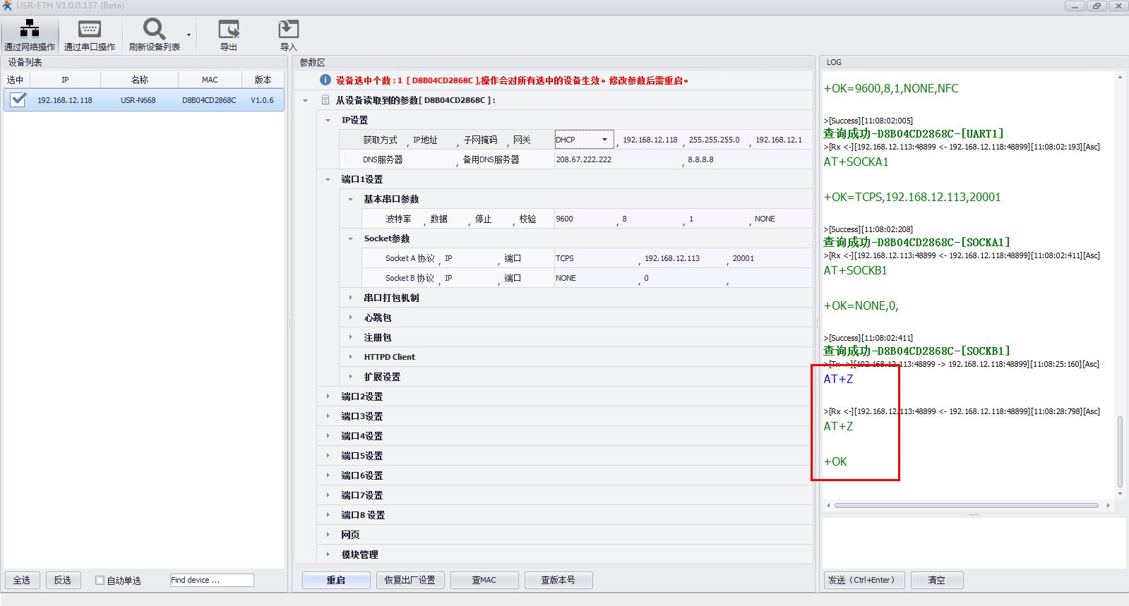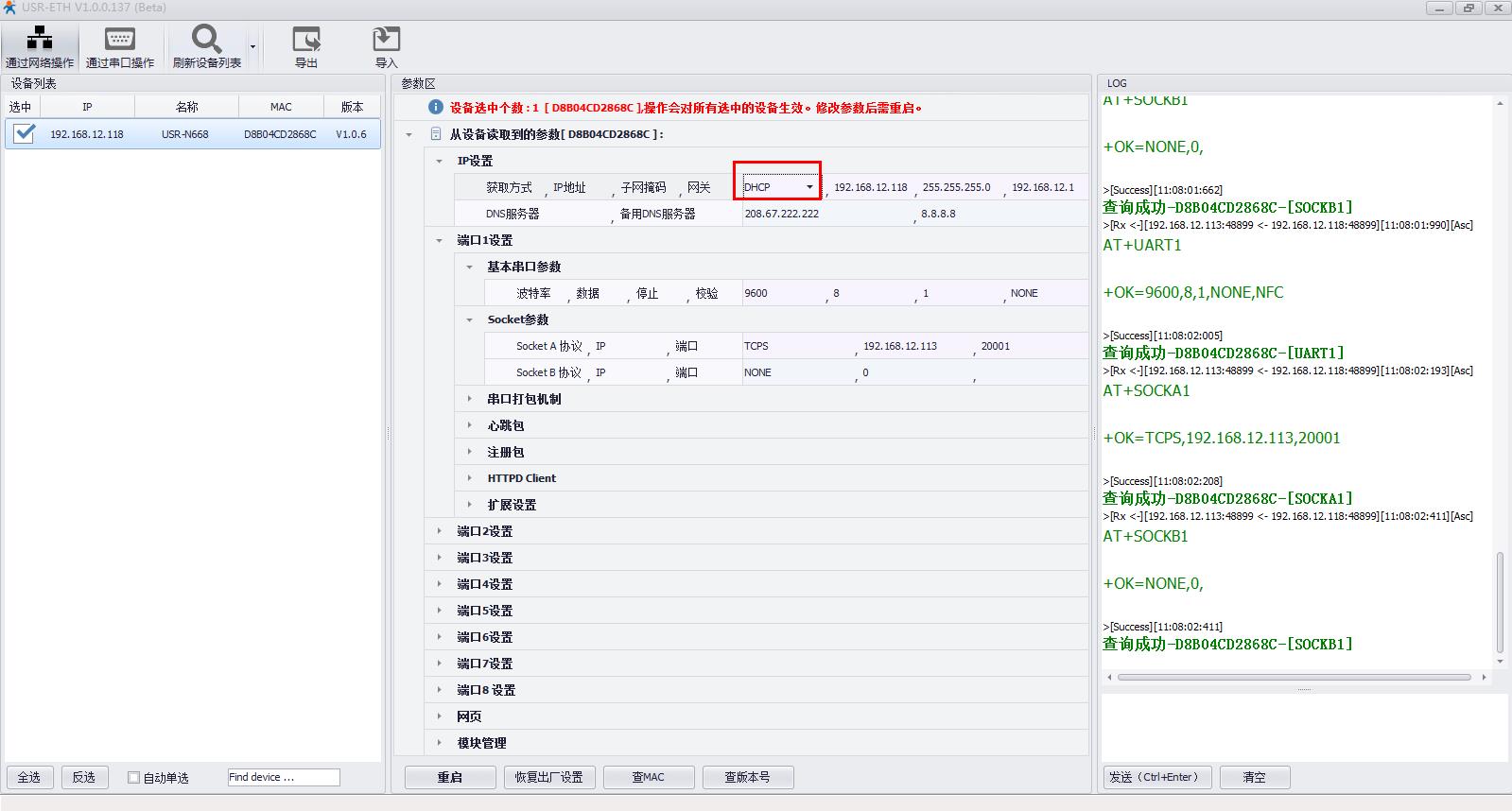 用N668設(shè)置軟件搜索USR-N668的IP,192.168.0.7,USR-N668用串口設(shè)置軟件設(shè)置DHCP,動態(tài)獲取IP。