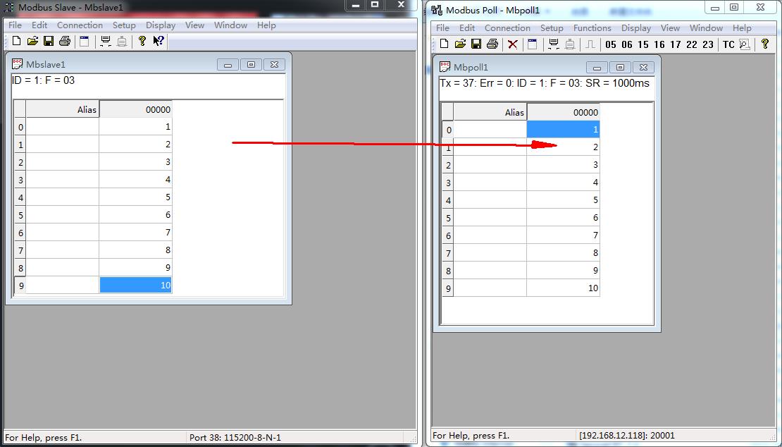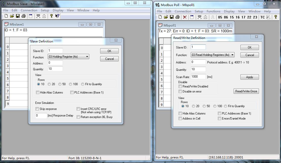 在電腦下載,并安裝打開MODBUS SLAVE和MODBUS POLL 軟件。軟件建立TCP連接,USB-RS232串口線接N668串口一和電腦,改變MODBUS SAVLE從機寄存器地址數(shù)據(jù),對應(yīng)MODBUS POLL 寄存器地址數(shù)據(jù)改變,就可以實現(xiàn)N668串口和網(wǎng)絡(luò)之間數(shù)據(jù)傳輸。