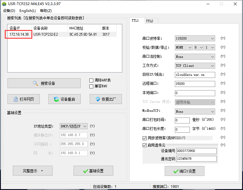 用M4設(shè)置軟件搜索USR-TCP232-E2的Ip。確定動態(tài)獲取的Ip172.16.14.38