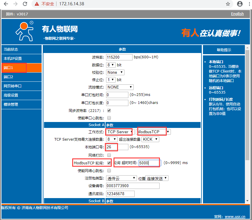 網(wǎng)頁檢查串口參數(shù),工作方式設(shè)置TCP server ,開啟ModbusTCp,本地端口號默認(rèn)是26,Modbus TCP輪詢默認(rèn)是關(guān)閉,需要勾選開啟MODBUS TCP輪詢。