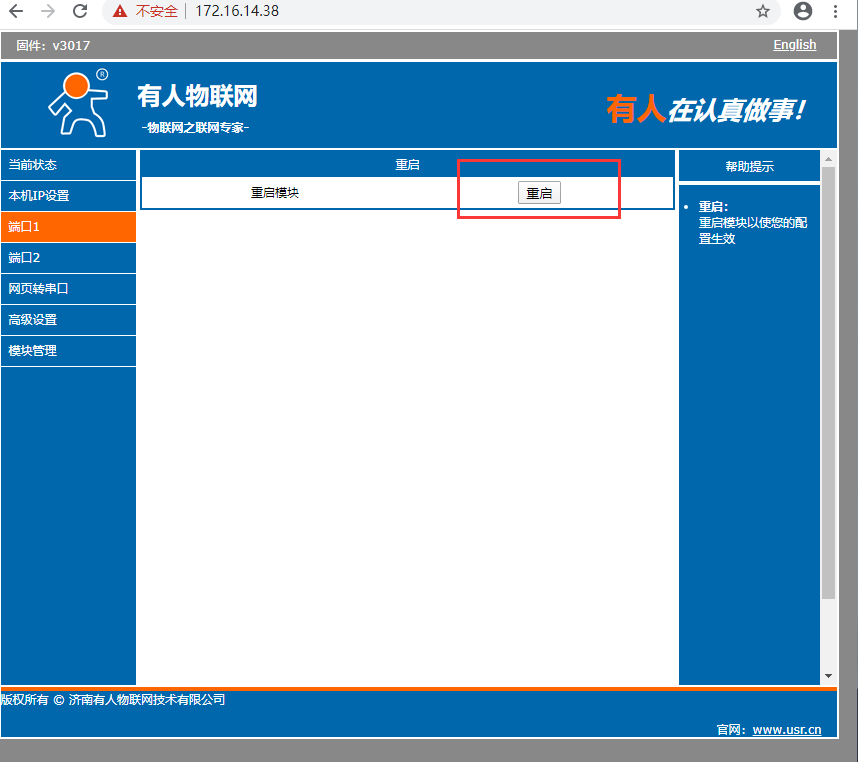 在電腦打開瀏覽器,輸入動態(tài)獲取的IP172.16.14.38 登錄USR-TCP232-E2的內(nèi)置網(wǎng)頁。
