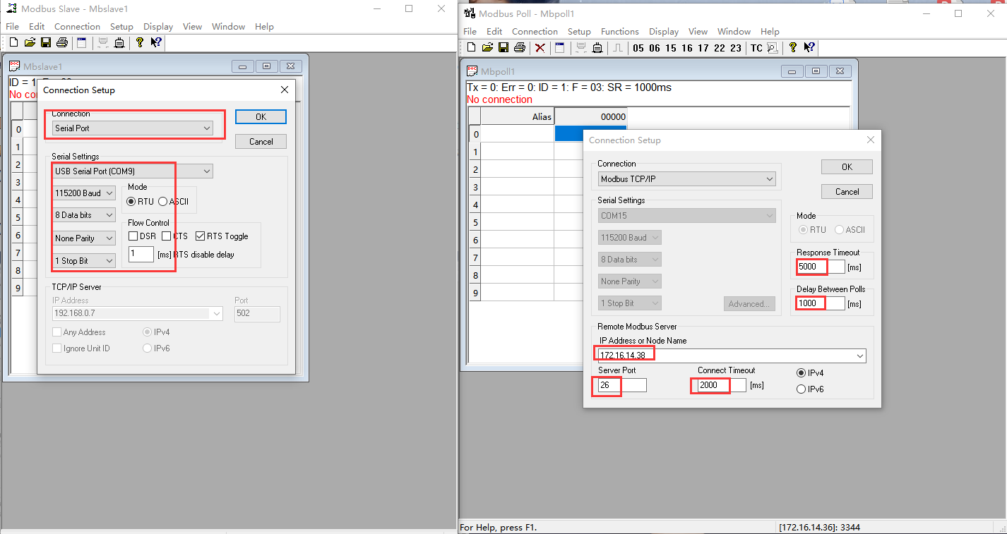 模擬測試用MODBUS SLAVE軟件做串口設(shè)備,用MODBUS pOLL軟件做網(wǎng)絡(luò)端。
