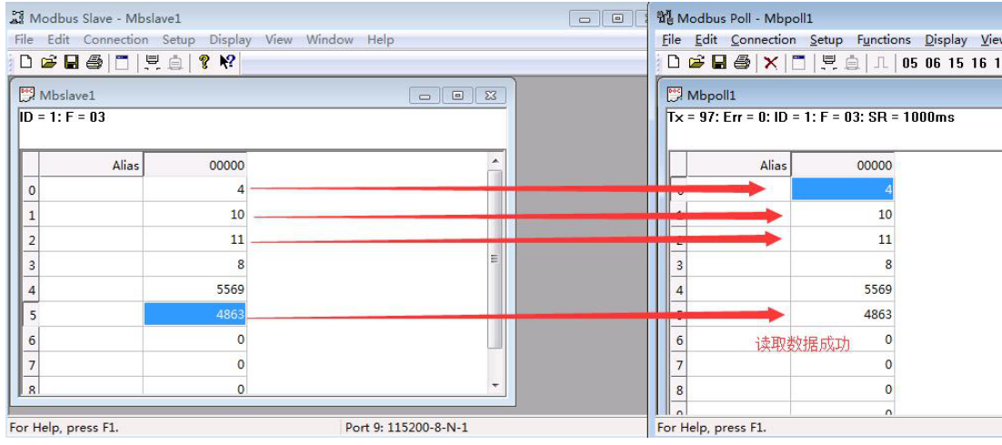 6.改變每個MODBUS SLAVE軟件的數(shù)據(jù),對應(yīng)的MODBUS POLL軟件就可以采集到正確的數(shù)據(jù)。