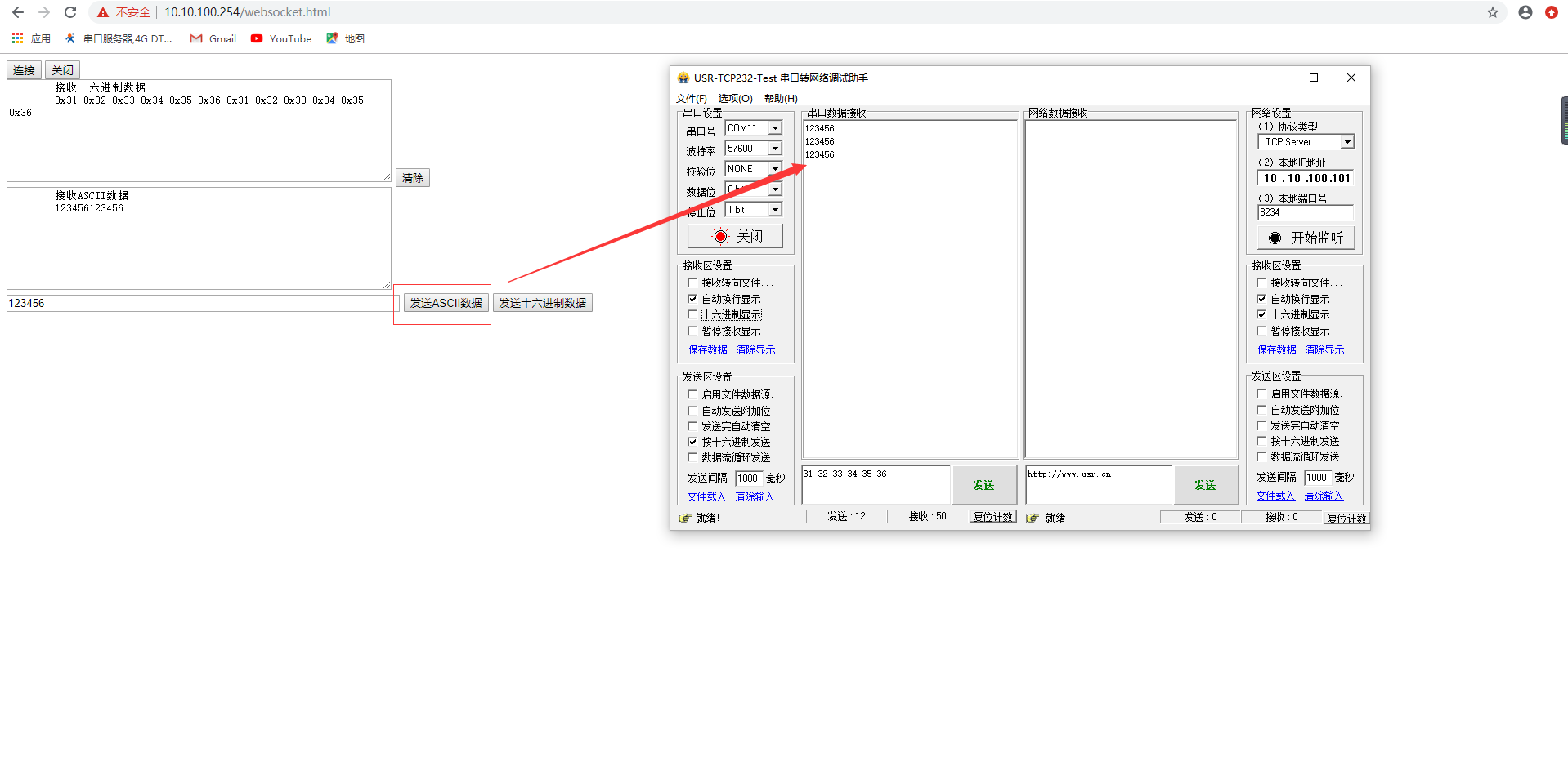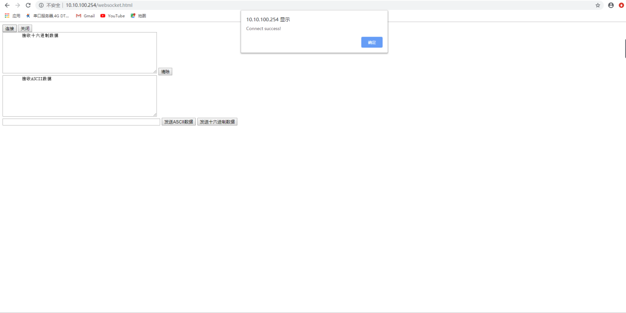 2.瀏覽器輸入10.10.100.254/,進入websocket頁面,點擊連接,可以看到連接成功的提示