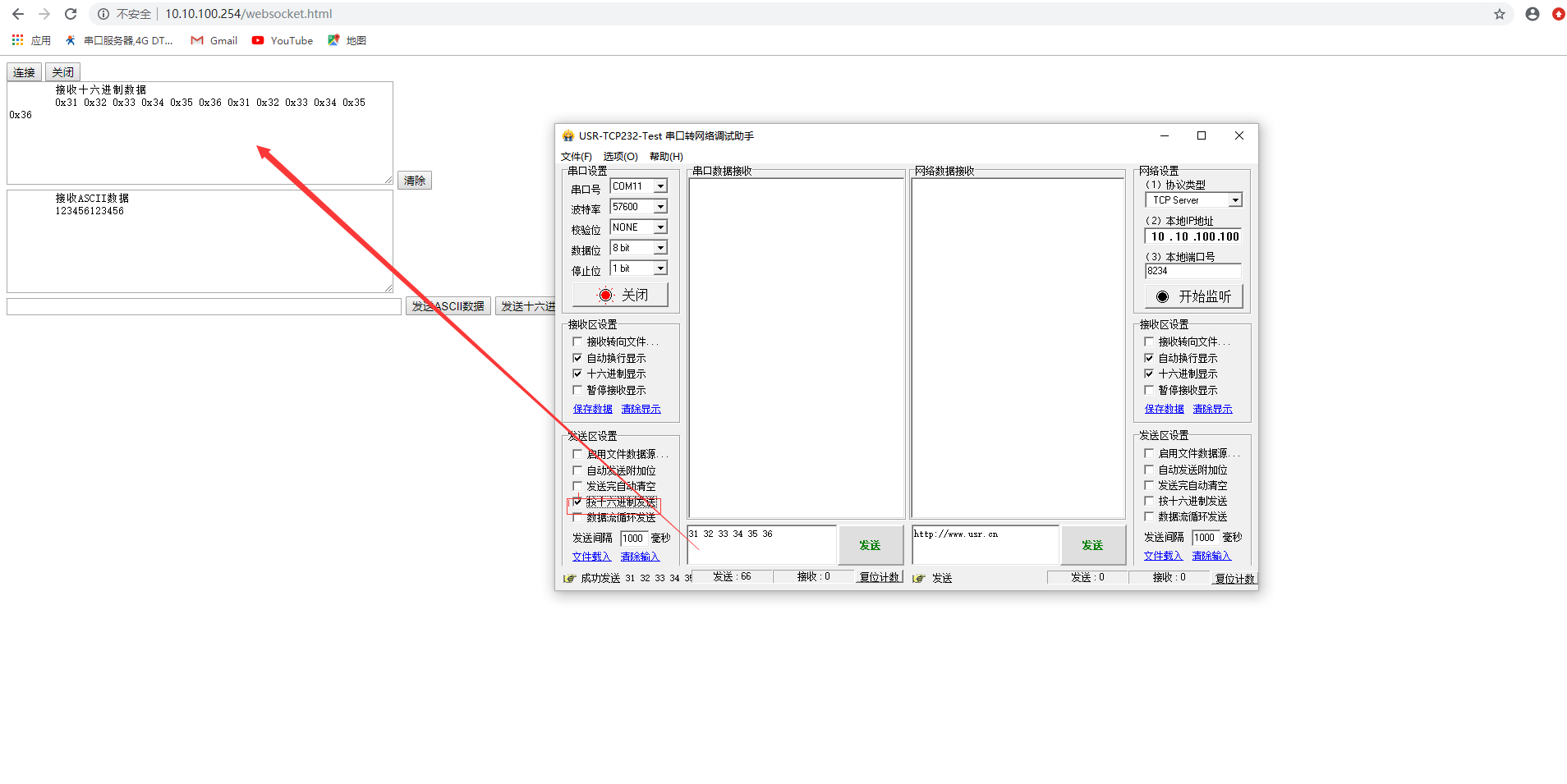3.使用串口調(diào)試助手打開串口,串口參數(shù)和W630的內(nèi)部串口參數(shù)設置一致,支持ASCII和十六進制發(fā)送和接收