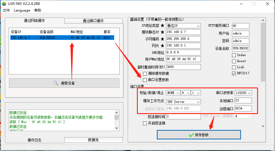 串口端選擇正確的串口(可在設(shè)備管理器--端口處查看)以及串口參數(shù),302出廠默認(rèn)115200,N,8,1。