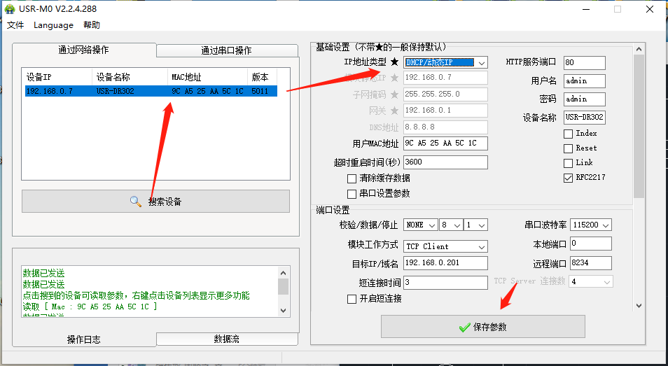點(diǎn)擊“搜索設(shè)備”當(dāng)搜索列表中出現(xiàn)302的設(shè)備后,單擊搜索到的設(shè)備,右邊基礎(chǔ)設(shè)置,在“Ip地址類型”將靜態(tài)Ip改為DHCp動(dòng)態(tài)獲取,點(diǎn)擊保存參數(shù)。