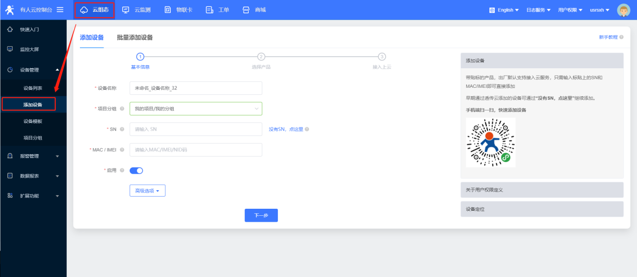 6、添加設(shè)備時(shí),自定義設(shè)備名稱“wifi透?jìng)鹘M測(cè)試模塊”,模塊目前只能使用ID方式添加設(shè)備id,不能直接使用SN碼添加設(shè)備, 點(diǎn)擊“沒有SN,點(diǎn)這里”,使用設(shè)備id和密碼默認(rèn)添加就可以,點(diǎn)擊一下步。