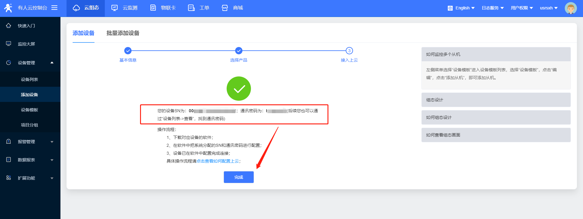 14、設(shè)置完所有的參數(shù)要重啟設(shè)備,稍等一會(huì),在有人云界面,您會(huì)看到設(shè)備已經(jīng)上線