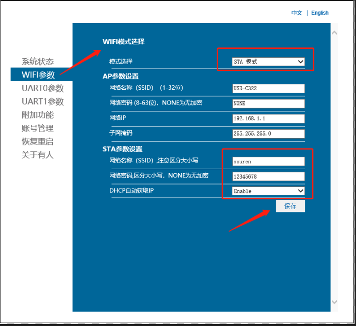 12、內(nèi)置網(wǎng)頁(yè)的賬號(hào)和密碼都是admin,進(jìn)入以后選擇模式選擇模式選擇為sta模式,設(shè)置要連接的wifi名稱、加密類型、算法、密碼,點(diǎn)擊保存;(先不要重啟,等設(shè)置完所有的參數(shù)再重啟設(shè)備)。