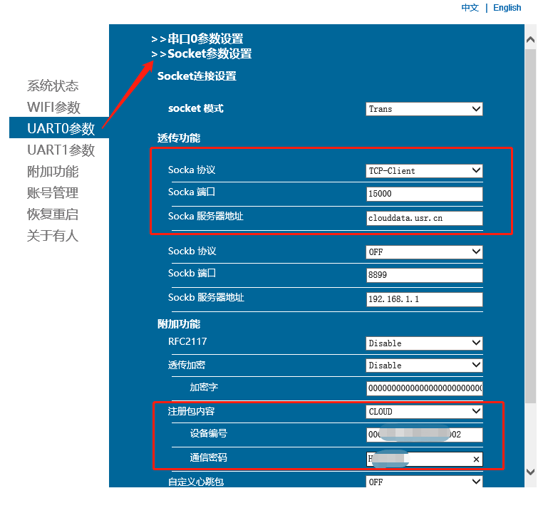 附加功能,注冊(cè)包選擇透?jìng)髟?,填上透?jìng)髟粕闲陆⒌脑O(shè)備id,和密碼(如下圖所示),點(diǎn)擊保存并重啟C322使配置參數(shù)生效。