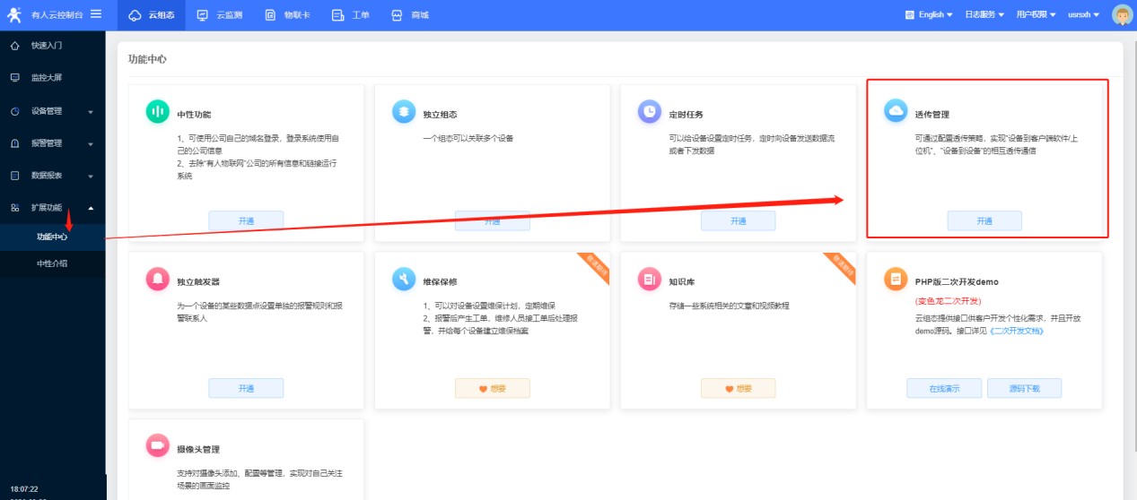 16、在“擴(kuò)展功能”-“功能中心”選擇開通“透?jìng)鞴芾怼惫δ?