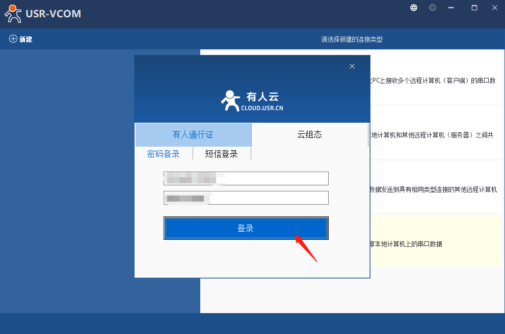 打開虛擬串口軟件,點(diǎn)擊新建云設(shè)備-Vircom連接。在跳出的登錄頁(yè)面登錄自己的有人云賬號(hào)。