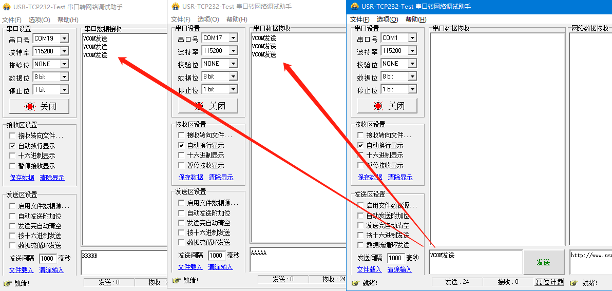 24、打開三個(gè)串口調(diào)試助手進(jìn)行數(shù)據(jù)通信測(cè)試,測(cè)試結(jié)果如下。其中模塊與電腦通過串口線直連所識(shí)別出來的串口號(hào)可以在設(shè)備管理器中查看。