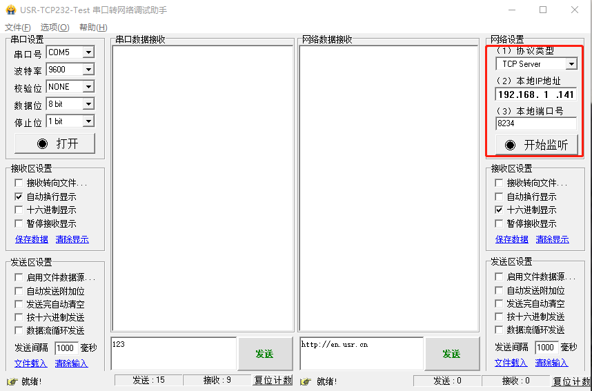 2、電腦打開串口調試助手的網(wǎng)絡端,做TCp server。
