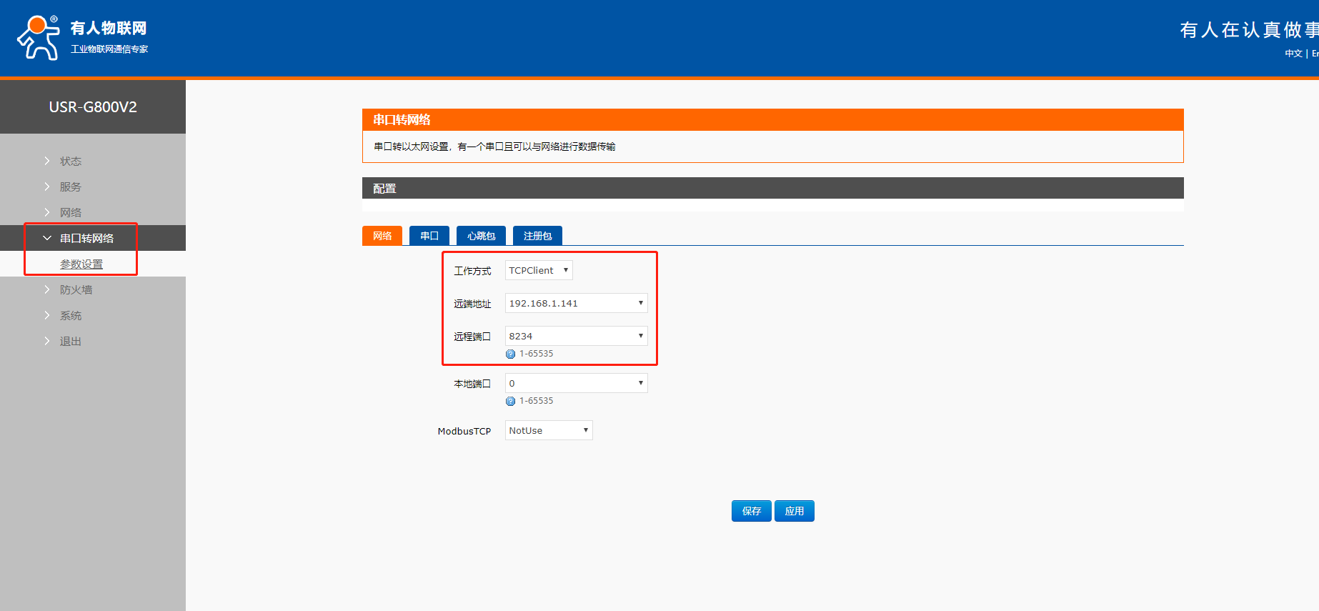 網(wǎng)絡設置為tcp clinet,地址設置剛剛串口助手的Ip和端口號。之后保存,應用。