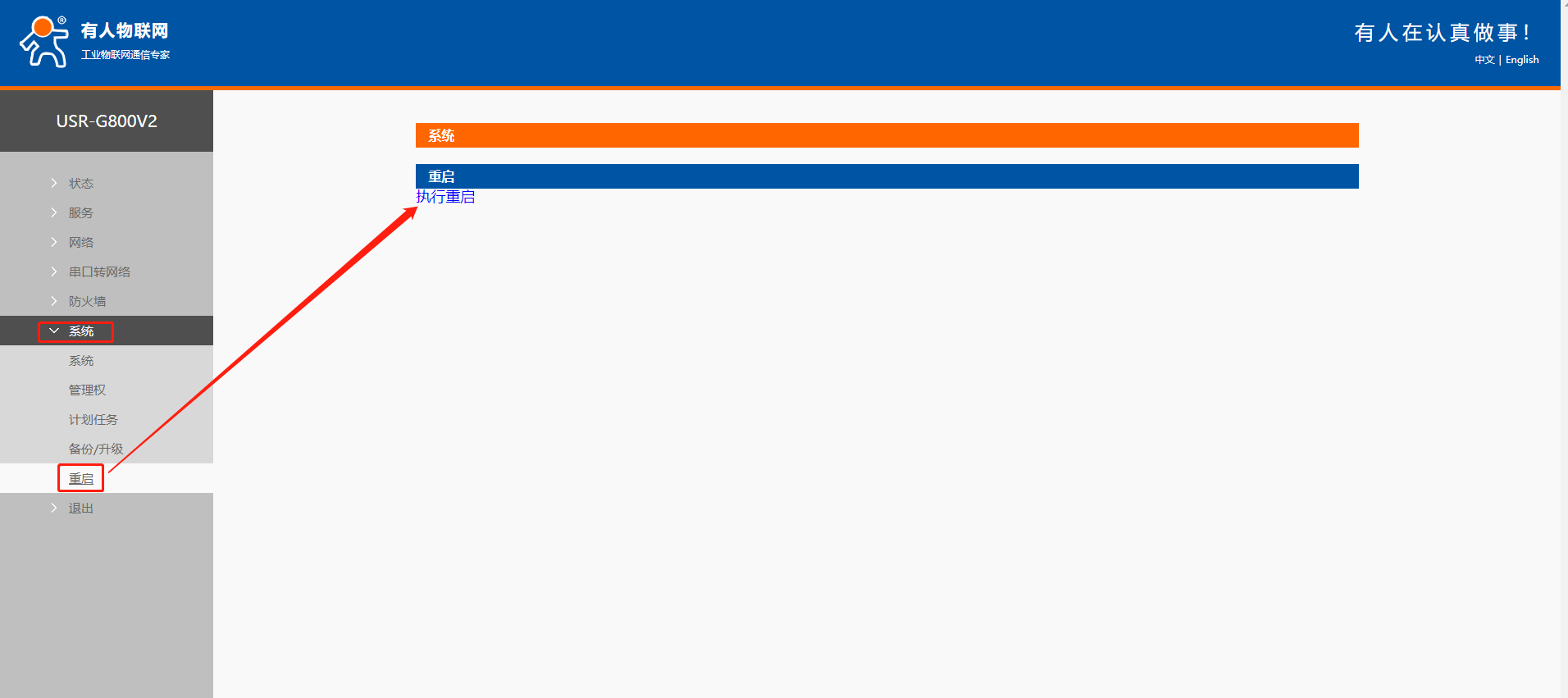 5、設置完成后,內(nèi)置網(wǎng)頁中選擇系統(tǒng)---重啟界面,執(zhí)行重啟。重啟后設置的參數(shù)才能生效。