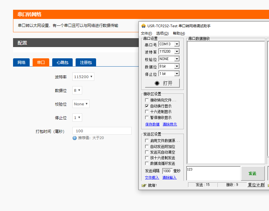 6、設備重啟完成可以看到串口調試助手網(wǎng)絡端已經(jīng)有連接對象,打開串口后,串口發(fā)送數(shù)據(jù)可以在網(wǎng)絡端收到。