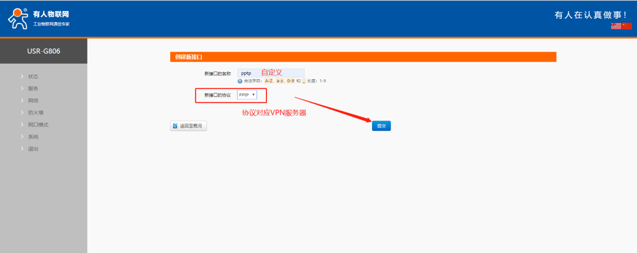 2、內(nèi)置網(wǎng)頁網(wǎng)絡(luò)--接口界面,新建一個接口名稱可自定義,協(xié)議選擇VPN服務(wù)器相應(yīng)的協(xié)議。比如要連接的VPN類型為PPTP,協(xié)議就選PPTP。