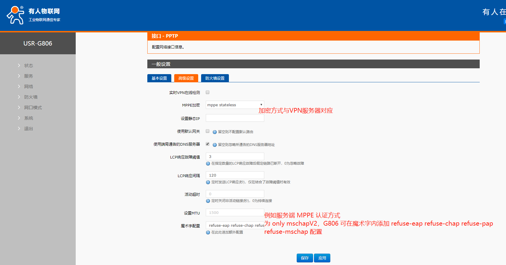 4、高級設(shè)置中加密方式與VPN服務(wù)器對應(yīng),其中加密方式可選:mppe stateful有狀態(tài)連接:會進(jìn)行頻繁更換密鑰,且在更換密鑰時會出現(xiàn)嚴(yán)重丟包;mppe stateless無狀態(tài)連接:只有在丟包的時候會進(jìn)行密鑰更改;no mppe服務(wù)端無 MPPE 加密方式時選擇此模式。魔術(shù)字:當(dāng)以上配置不滿足配置文件和服務(wù)端向匹配時在此添加附加配置。例如服務(wù)端 MPPE 認(rèn)證方式 為 only mschapV2,G806 可在魔術(shù)字內(nèi)添加 refuse-eap refuse-chap refuse-pap refuse-mschap 配置