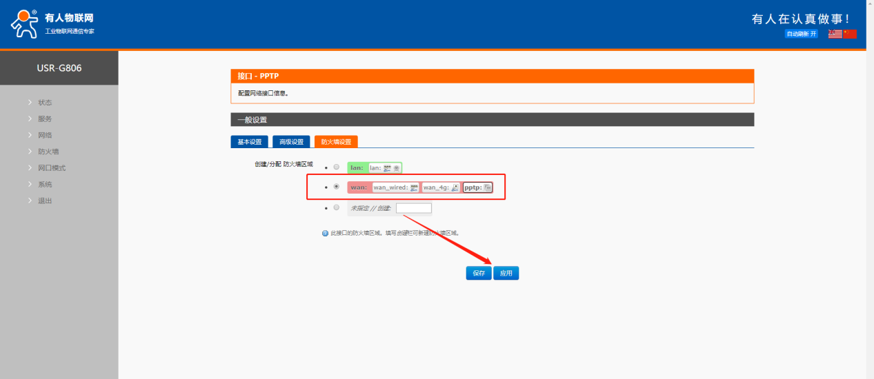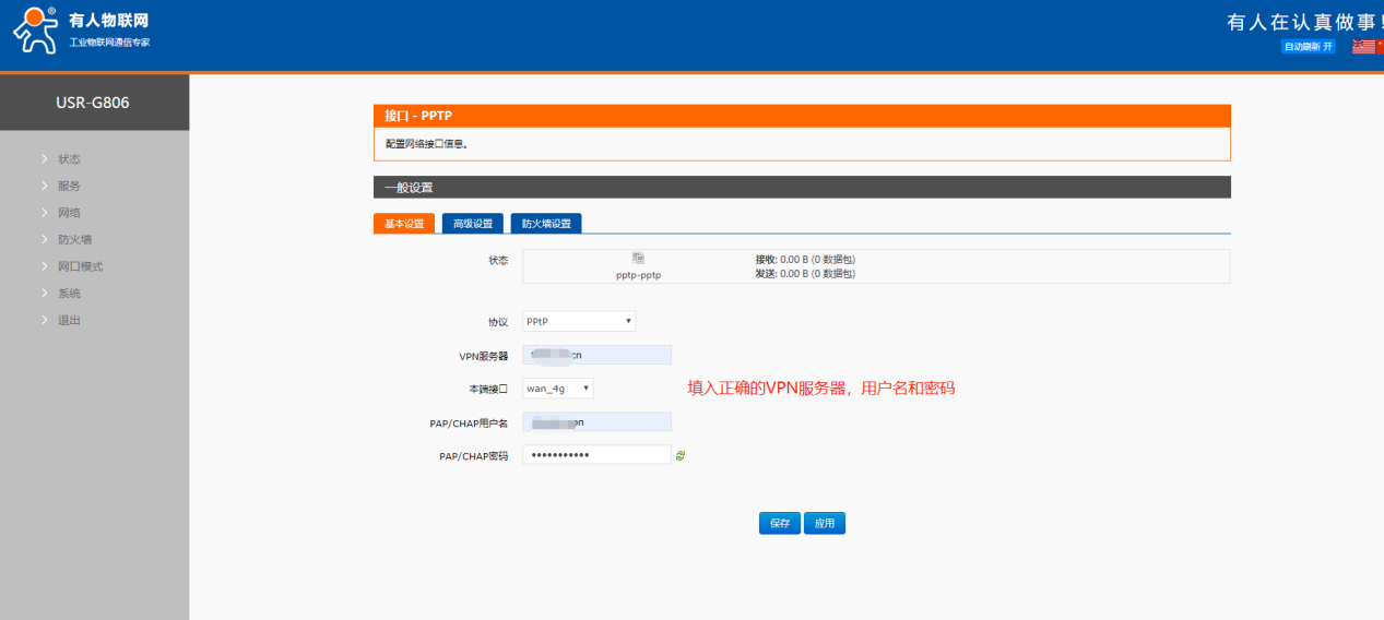 USR-G806:采用 4G 接口連接外網(wǎng),創(chuàng)建 PPTP 接口連接 VPN;