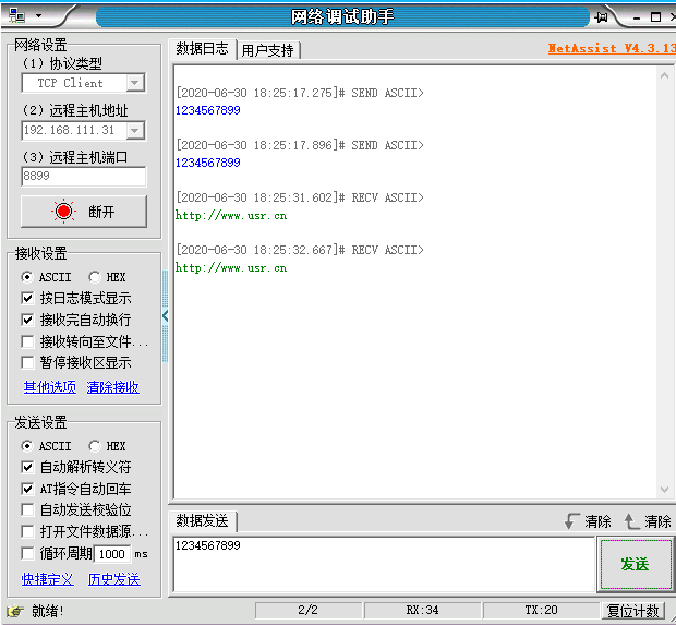 9、PC1即另一臺直接連上VPN的電腦,打開網(wǎng)絡(luò)調(diào)試助手,做tcp clinet端,IP設(shè)置806獲取到的VPN IP,端口設(shè)置為端口轉(zhuǎn)發(fā)的外部端口。能夠連接到 4G 路由器下的 TCP Server 并進(jìn)行通信。
