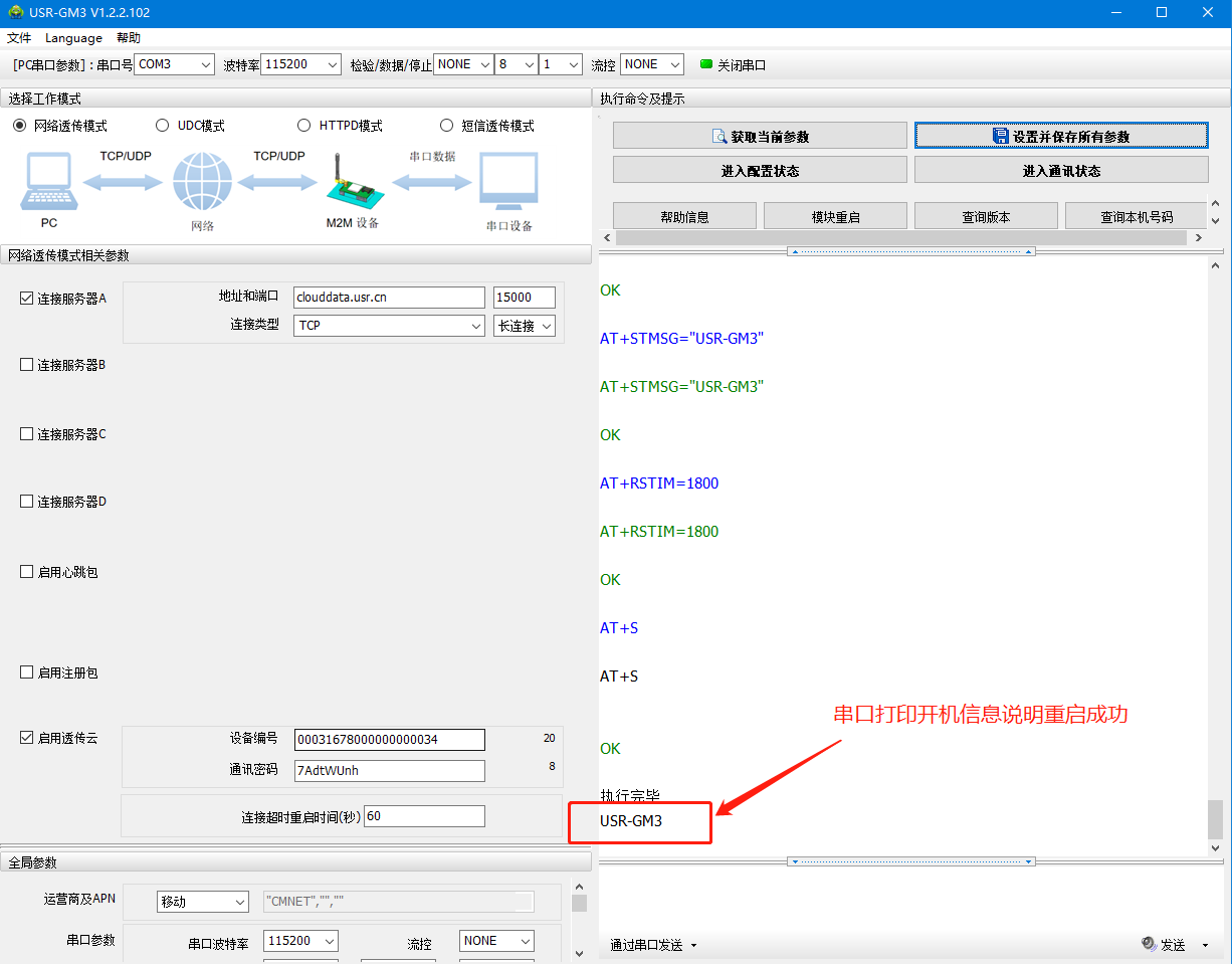 (2)默認串口參數115200 N 8 1,打開串口——進入配置狀態(tài)——返回OK說明進入配置狀態(tài)成功
