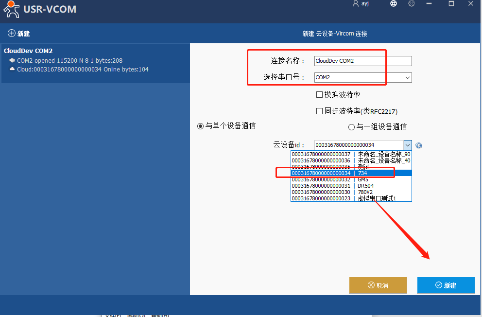 (3)自定義串口號——云設備ID選擇與虛擬串口通信的設備的ID