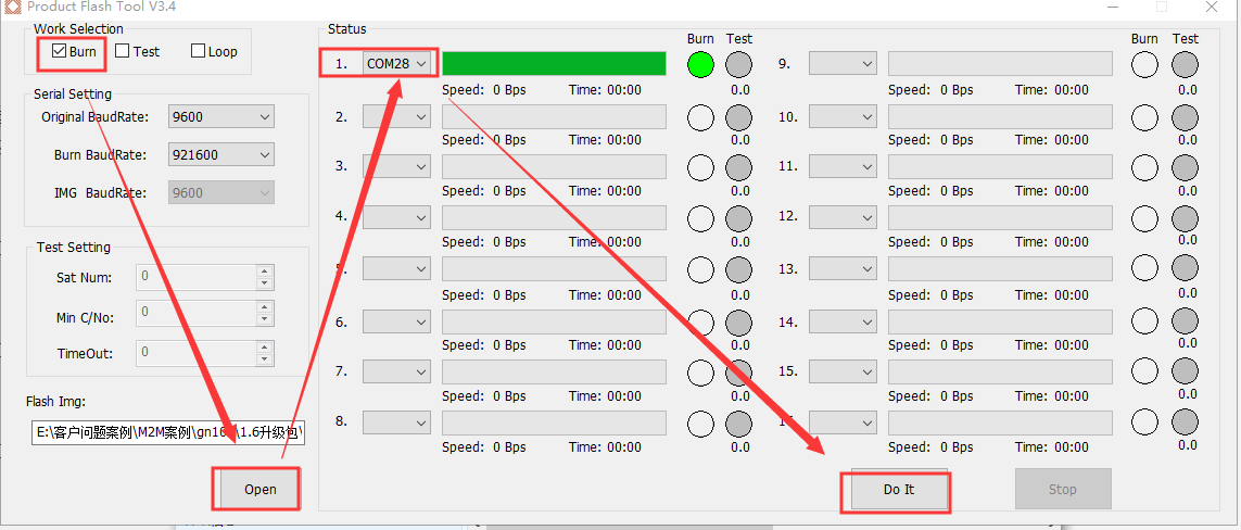 3、勾選Burn——點擊Open選擇固件——選擇串口號(可以在設(shè)備管理器查看)——點擊Do It,看到綠色進度條加載完成以后關(guān)閉軟件即可