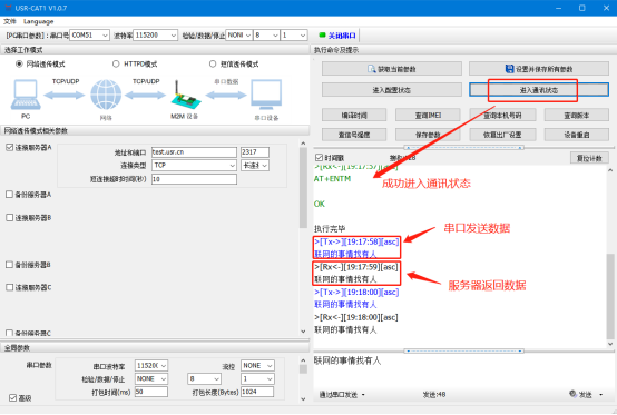 2、DTU出廠默認連接的是我司的測試服務器:test.usr.cn:2317;串口向服務器發(fā)送什么數(shù)據(jù),服務器就將接收到的數(shù)據(jù)返回到串口。