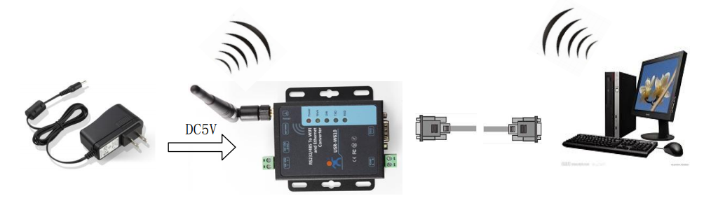 我們將 串口服務(wù)器USR-W610 串口服務(wù)器的串口與計(jì)算機(jī)的串口連接,串口服務(wù)器的 WIFI 和計(jì)算機(jī)的 WIFI 連接。臺式機(jī)如無自帶串口和 WIFI,可以用 USB 轉(zhuǎn) 232 線和無線網(wǎng)卡 來替代。硬件連接如下圖: